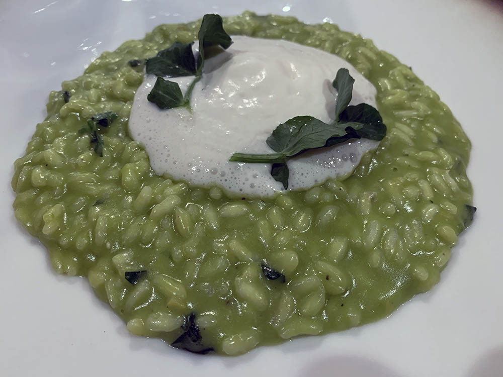 La proposta dei due primi ha colpito le mie papille gustative per l’estro utilizzato sapientemente: Ravioli con ricotta, vongole, zenzero e polvere di alghe tritate e Risotto, piselli, limone e taleggio di bufala mantecato all’olio al rosmarino