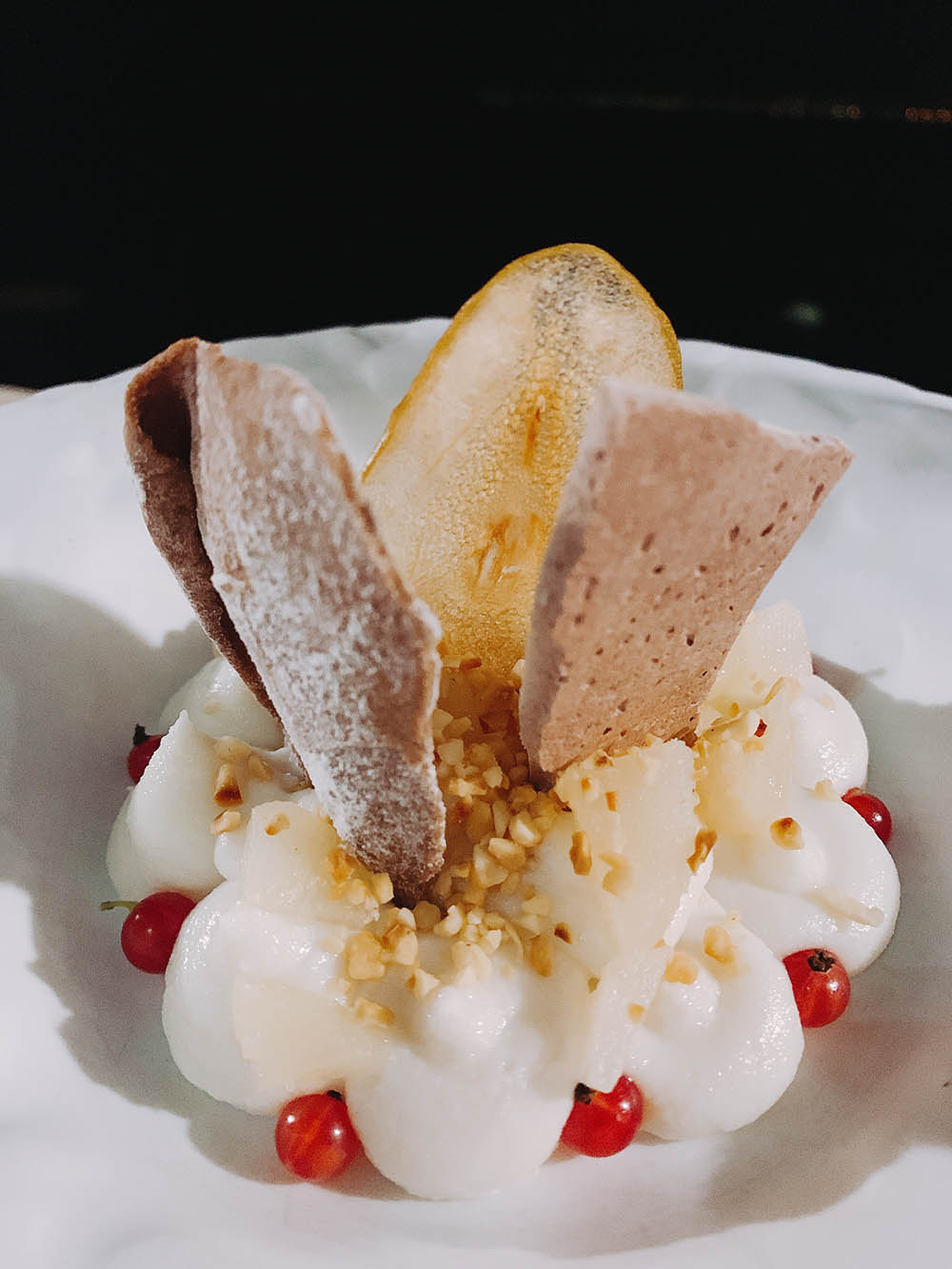 Chiusura con una ricotta e pera scomposta con croccante di cannolo siciliano e sorbetto al gelato con panna cotta.
