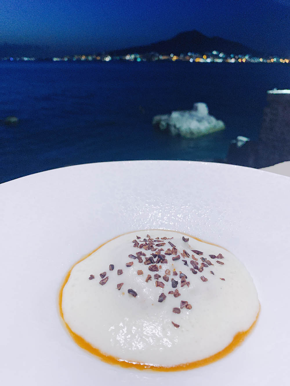 Scampo marinato e scottato spuma di latte e gruè di cacao con una tonalità di lime (tipo cappuccino). Un piatto ricco a partire dalla spuma intensa nel gusto fino ad arrivare al tocco delicato dello scampo marinato.