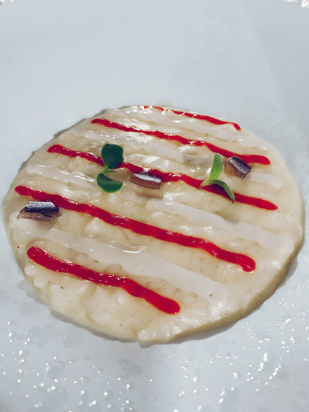 Continuiamo con un risotto lamponi, cremoso di bufala e maionese di alici del cantabrico uno dei must che più rappresenta lo chef. Un piatto pensato dove è elettrizzante la maionese di alici.