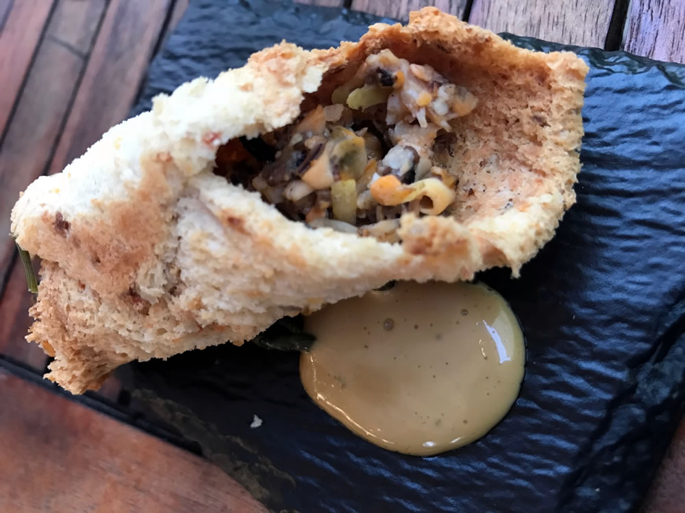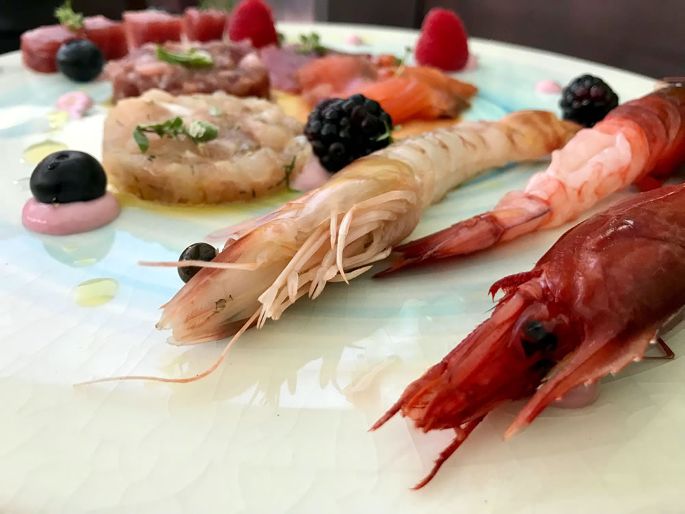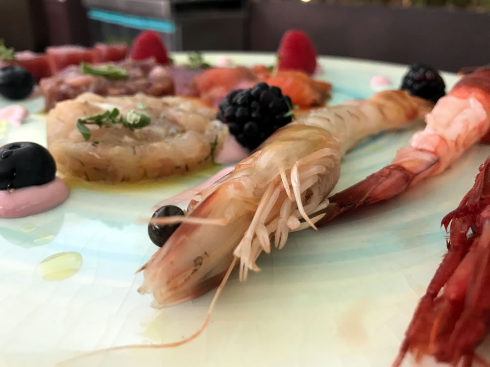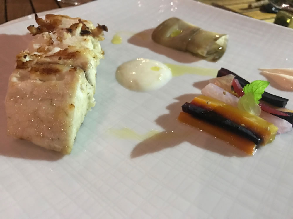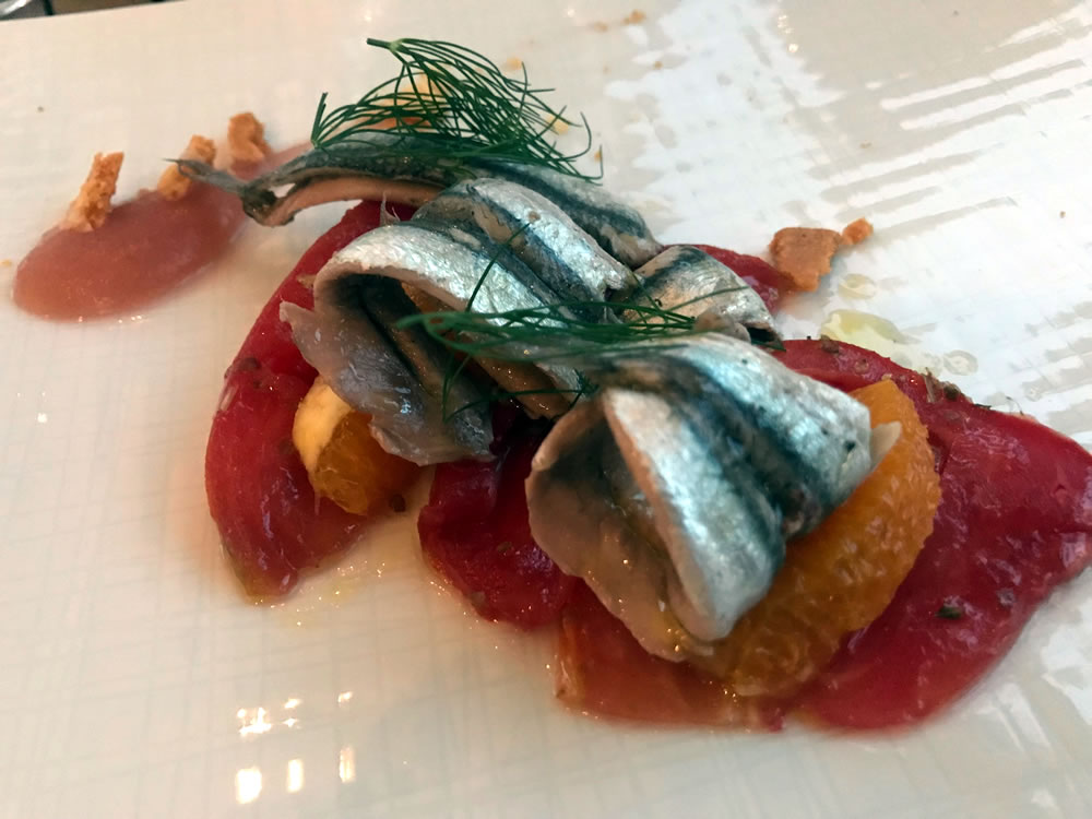 Ci ha colpito l’antipasto di apertura, ovvero selezione fusion di crudi del Borgo e a seguire un contrasto perfetto tra sapidità e dolcezza alice marinata in aceto di fragoline, su pomodoro di Sorrento e arancia. In abbinamento: Puro Verdeca Salento bianco Igp 2017 Tenuta Marano