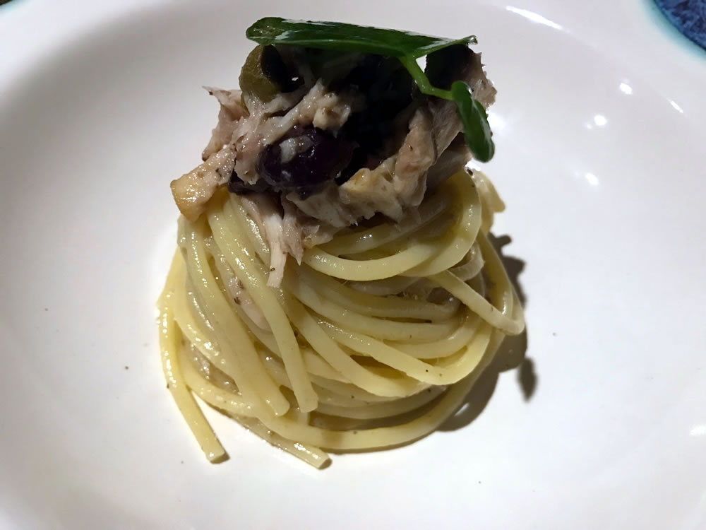 Spaghettone ‘’Pastai Gragnanesi’’ alla buonadonna con ricciola olive nere di Gaeta e capperi di Salina