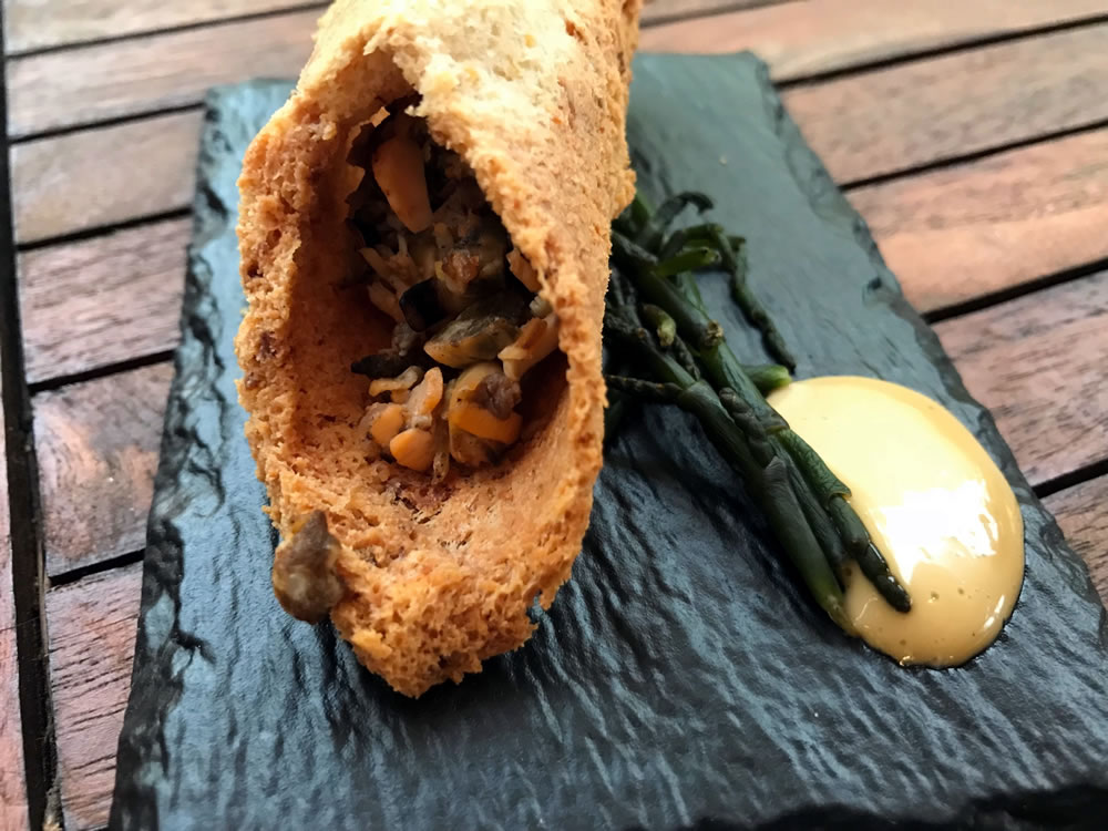 La serata ha avuto inizio con un aperitivo di benvenuto con cannolo di pane stirato alle cicerchie con pesto di cozze del Fusaro e zest di limone, gallette soffiate di segale con velluto di gambero Viola e mezzo Pacchero ‘’Pastai Gragnanesi’’ piastrato farcito con ombrina con perle di tapioca in abbinamento un Baldassarri brut, Vino spumante Brut Bianco Blanc de Noir 2017 Tenuta Marano.