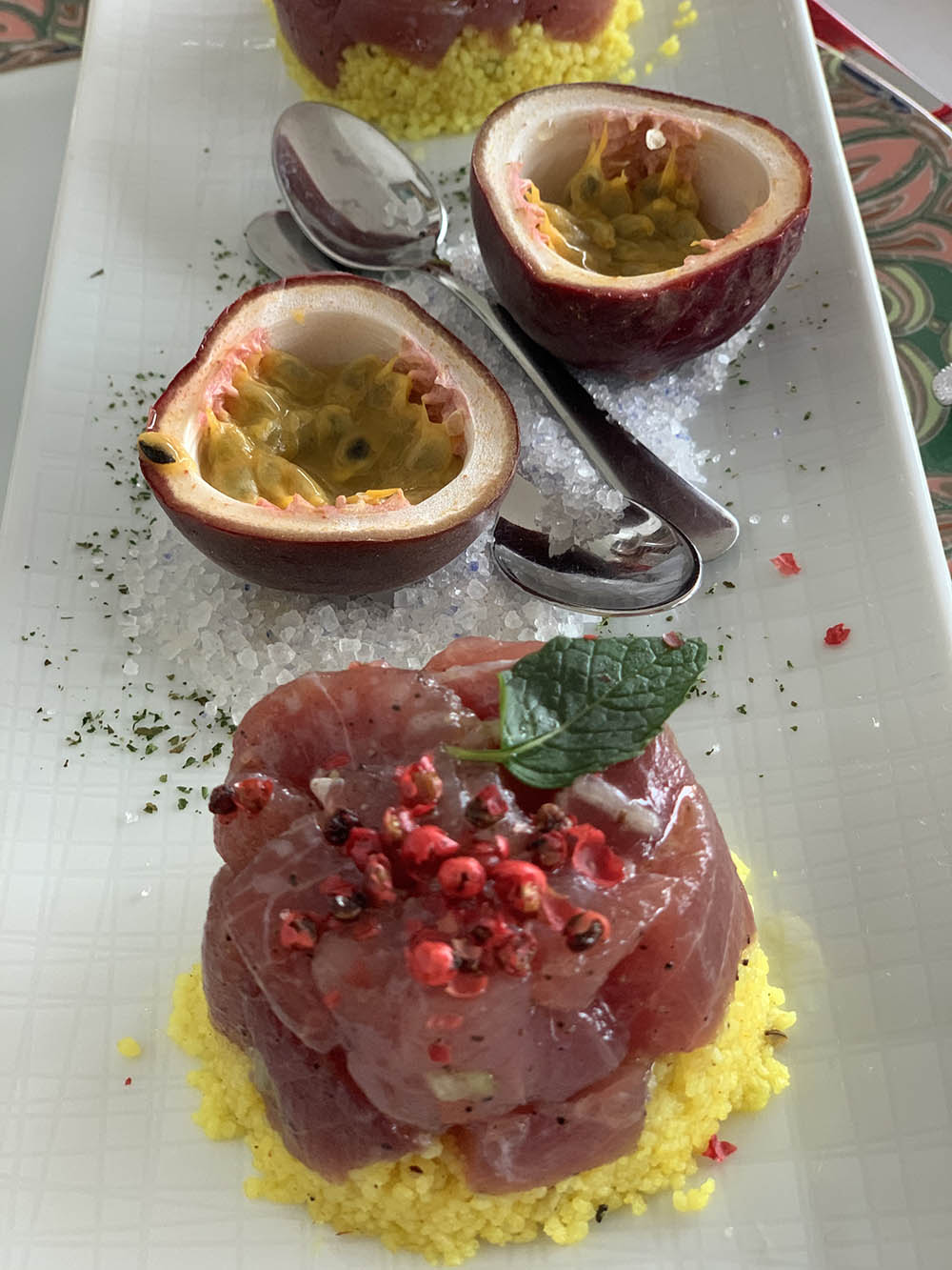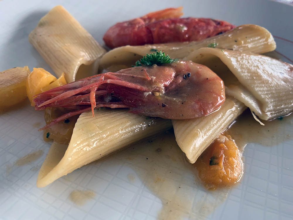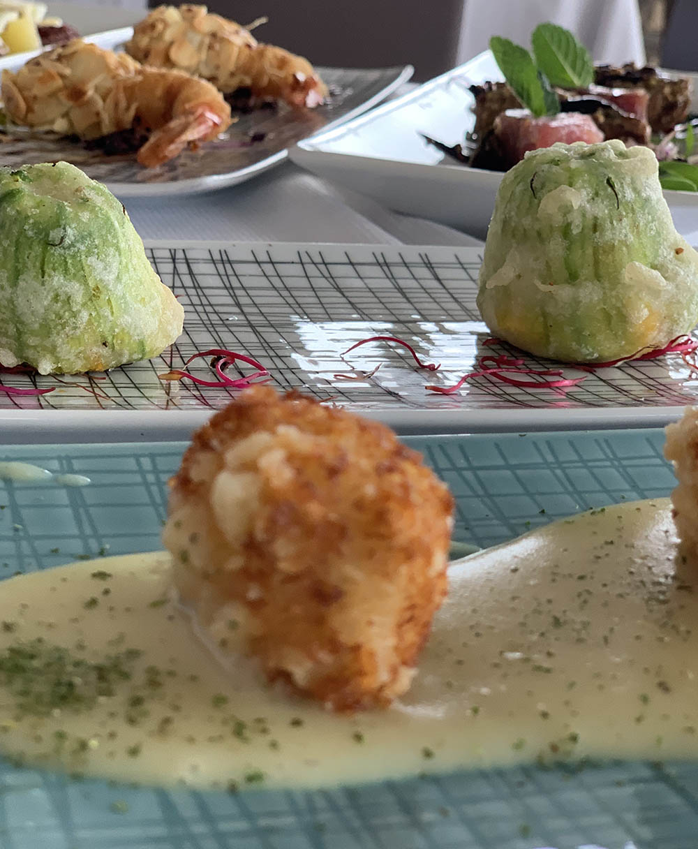 A seguire antipasti che fanno gola a tutti, basti pensare al gambero mandorlato con spaghetto kataifi, fiori di zucca ripieni di ricotta di fuscello, provolone del Monaco e acciughe, cubetto di tonno alle erbe, salmone gratinato, insalata di polpo e dulcis in fundo tartare con curcuma accompagnato dal frutto della passione e gli immancabili crudi: gambero di Crotone, pesce locale sfera, ostriche, limone di mare.
