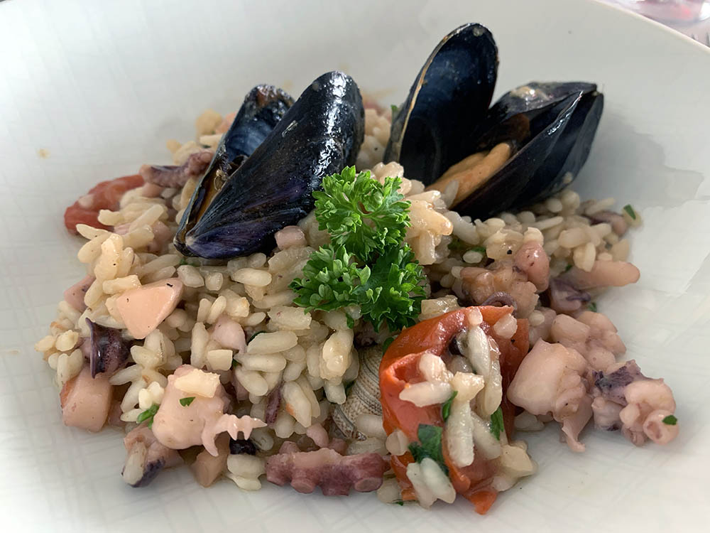 I due primi sono al sapore di mare: bombardoni con gamberi, lime e pomodorini gialli e risotto carnaroli alla pescatora.