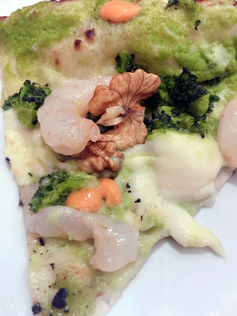 La pizza “La Locanda del Testardo” ha come ingredienti crema di broccoli, broccoli baresi, crudo di gamberi bianchi di Procida, provola, noci di Sorrento e olio extravergine di oliva.