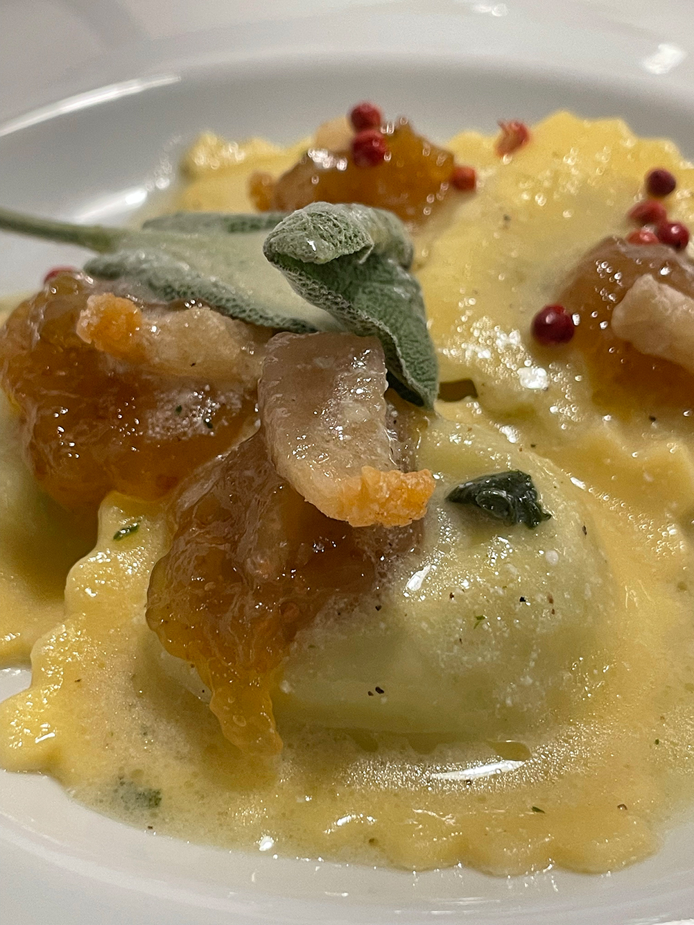 Dalla sezione primi, ecco il raviolo dello chef: un raviolo artigianale con ricotta, burro e salvia, lardo croccante e marmellata di fichi. Il raviolo è ben fatto e il ripieno è gustoso e bilanciato. La marmellata di fichi in contrasto con il lardo croccante è un tocco dolce che completa il piatto.