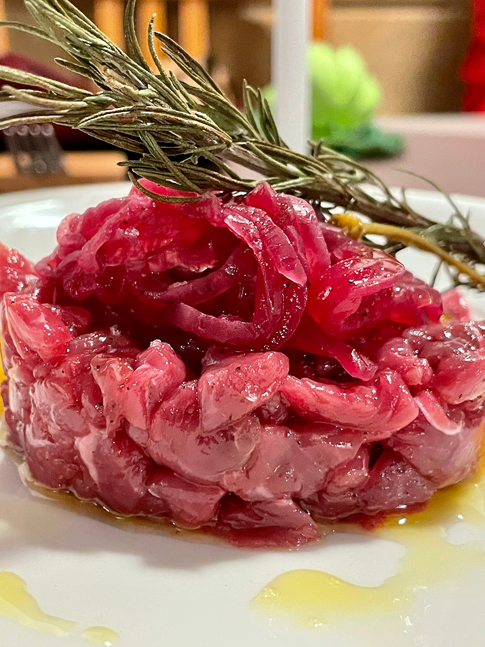 Per antipasto, ordiniamo la tartare di manzo, con cipolla caramellata di Tropea, salsa datterino giallo e cappero di Pantelleria. La tartare è di ottima qualità, con carne morbida e saporita. La cipolla caramellata è un tocco di gusto in più, che si sposa perfettamente con la salsa e il cappero.