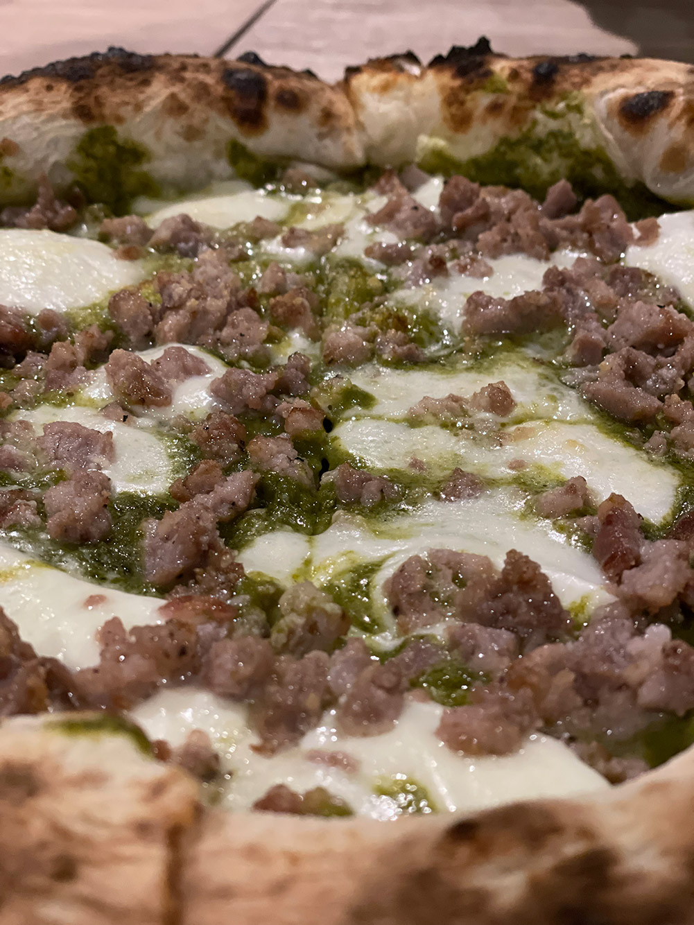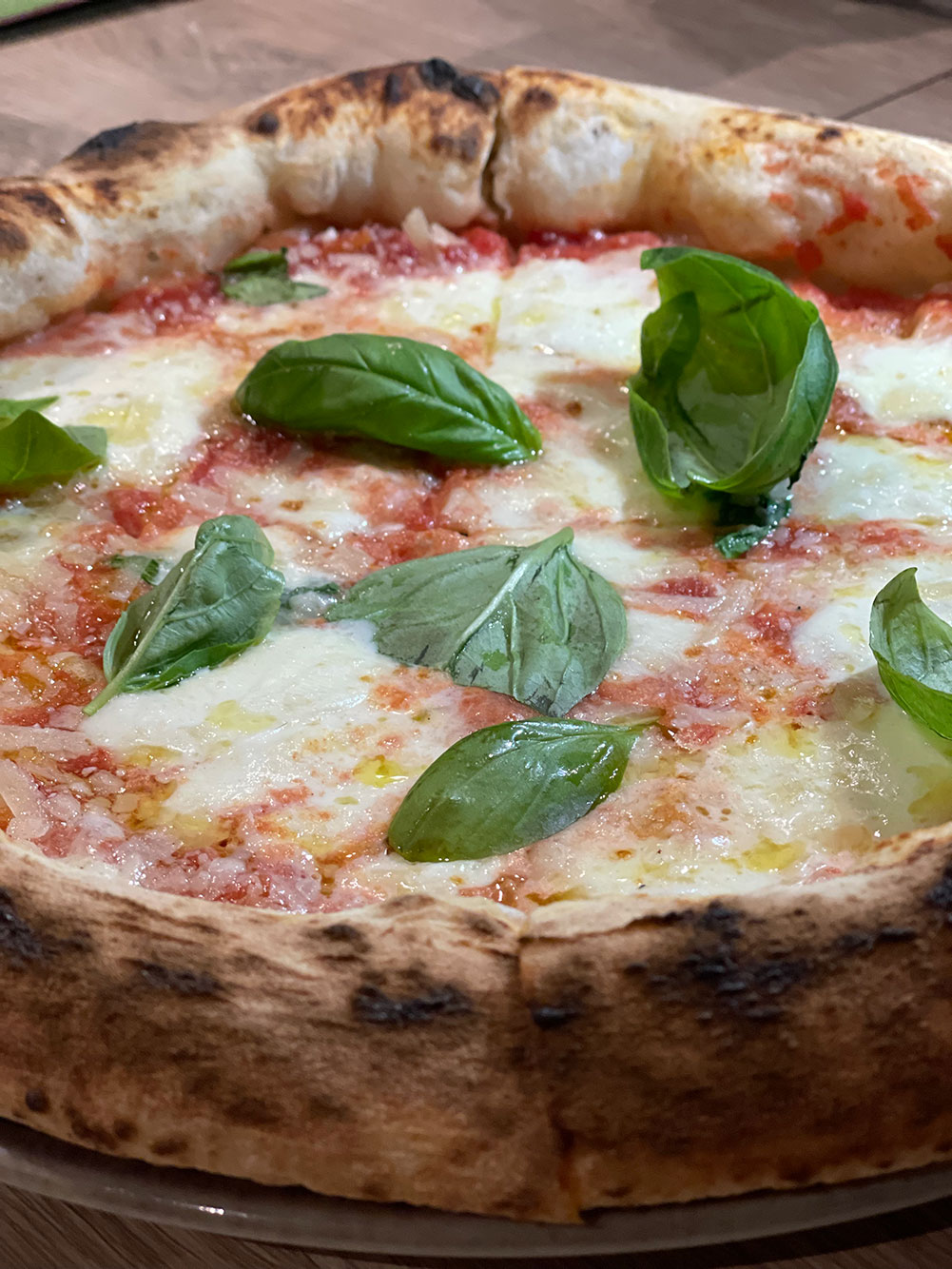 Margherita San Gennaro: Pomodoro San Marzano (miracolo di San Gennaro) frantumato a mano, mozzarella misto bufala, parmigiano reggiano Dop alta stagionatura, basilico, olio evo