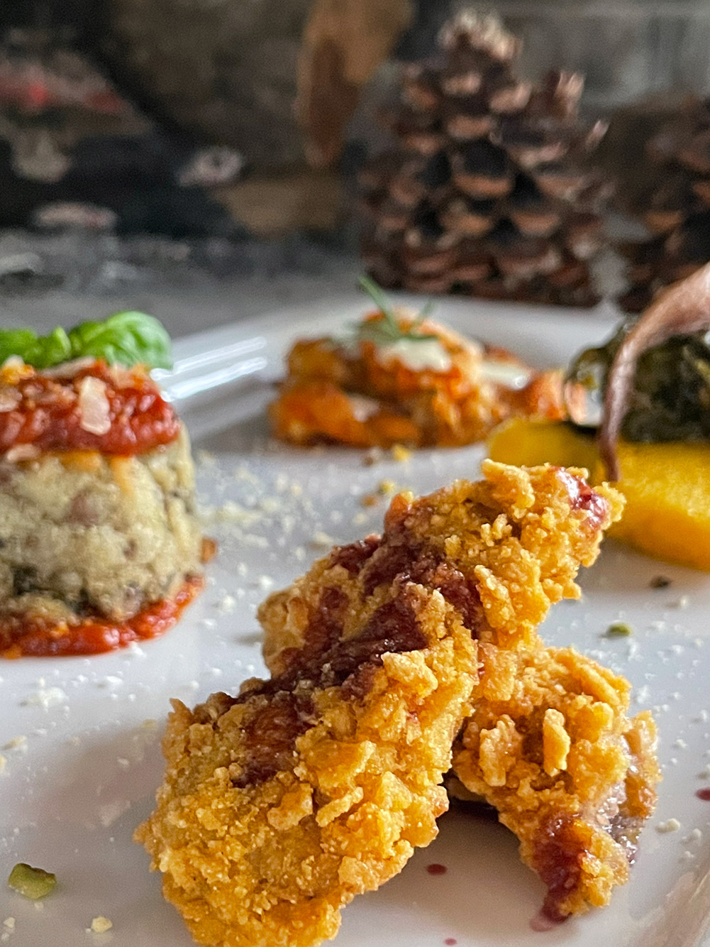 A seguire una degustazione di tartare a forma di Ferrero roche di fassona e aceto balsamico, Carpaccio affumicato con rucola e parmigiano, mozzarella e prosciutto crudo e cheescake di tarallini con stracciata e pomodorino.