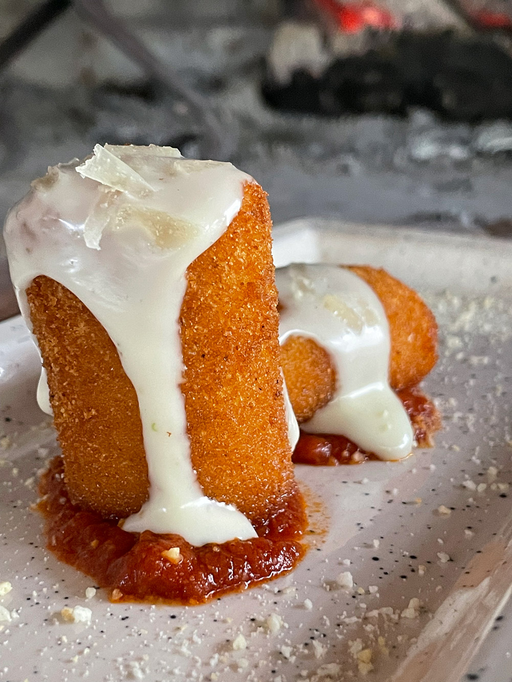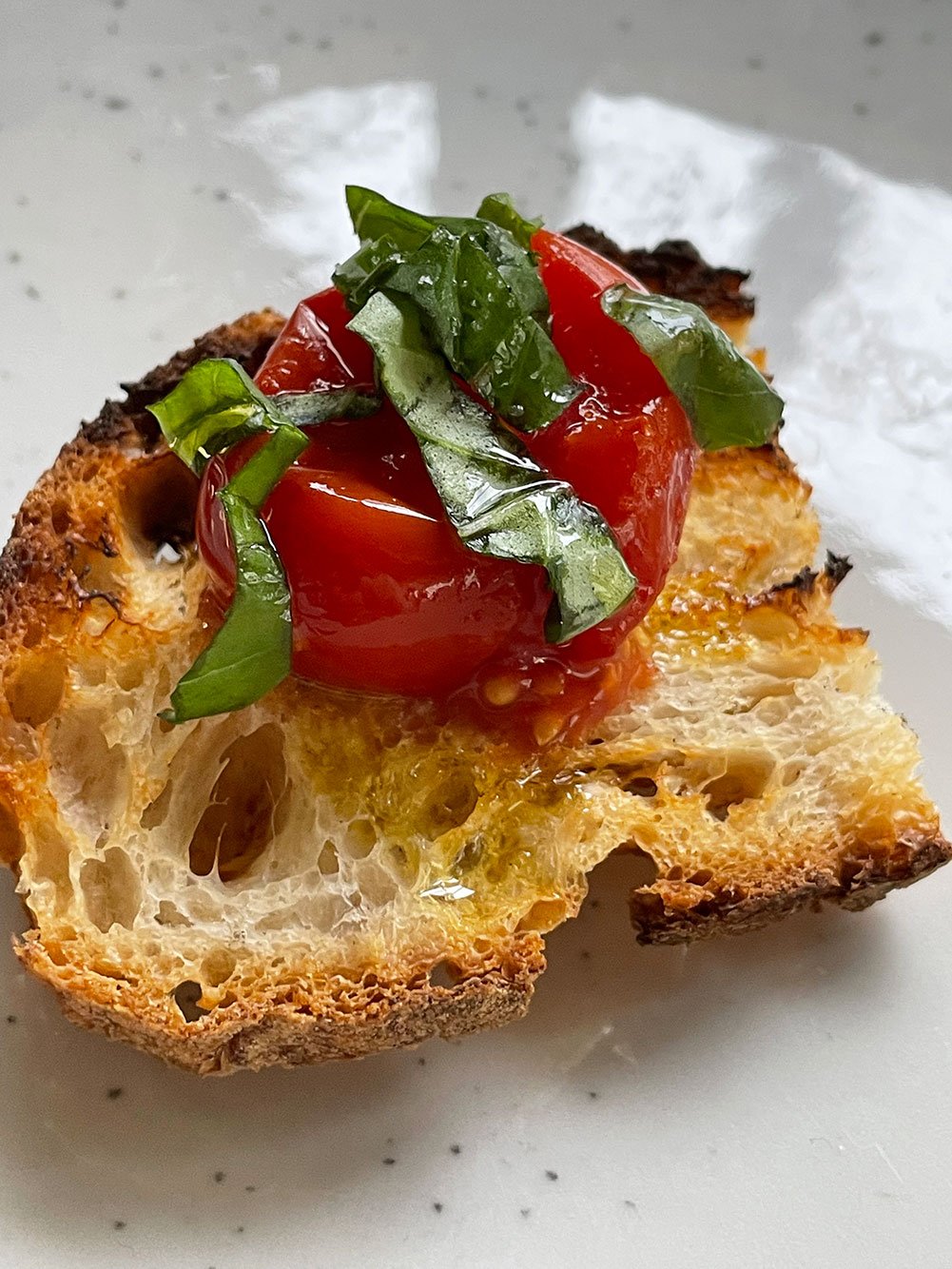Iniziamo il percorso con un ottimo piedirosso dei Campi Flegrei e con una bruschetta farcita al momento a tavola con pomodorino corbarino e aggiunta di olio pregio biologico 100% italiano. Esplode in una combinazione di sensazioni gustative.