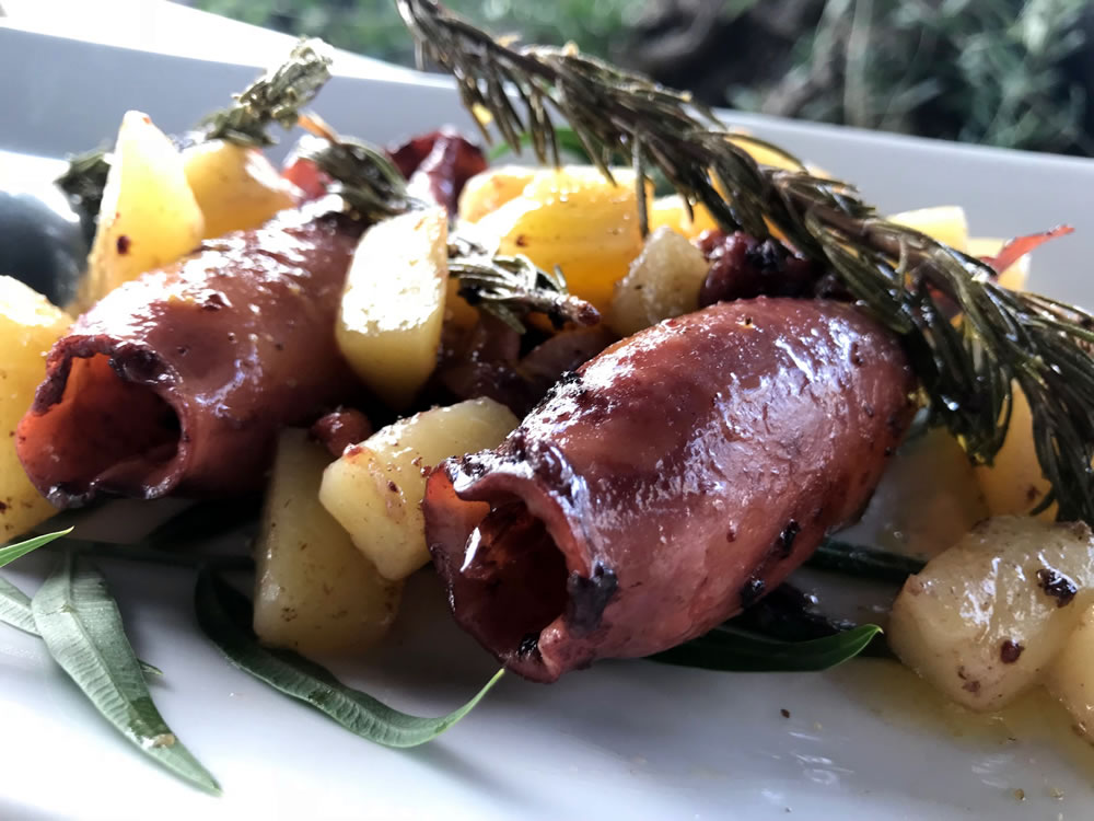 A seguire totano ripieno in cui il contrasto lascia spazio ad una piacevole armonia di sapori e colori.