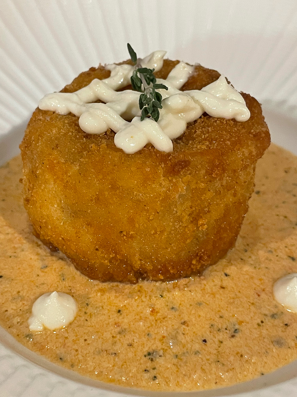 A seguire timballetto di “Panpizza” (Pane raffermo ricavato dal riuso dei panetti dell’impasto), cioè un timballo di tagliolini di “Panpizza” fatti a mano legati con salsa besciamella artigianale e farciti con cuore di carne tritata di Scottona (selezione Bifulco) e piselli centogiorni (presidio Slow food), impanato con pan grattato di “Panpizza” e dorato in olio di Girasole alto oleico. Servito su letto di salsa di provola affumicata aromatizzata al pomodorino del Piennolo del Vesuvio Dop semidry e origano selvatico e guarnito con fonduta di Provolone del Monaco Dop.