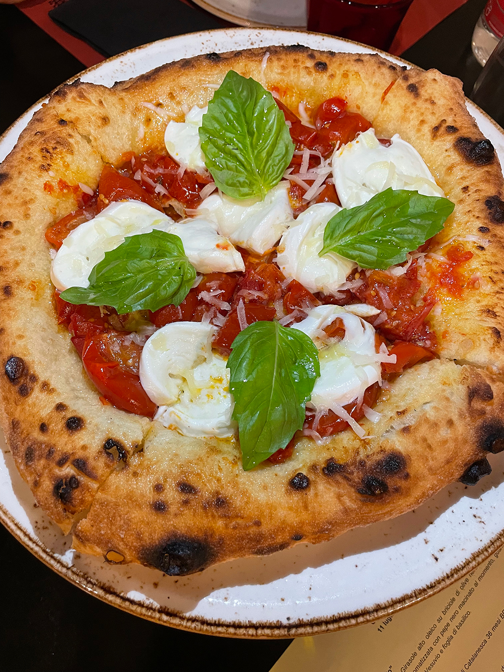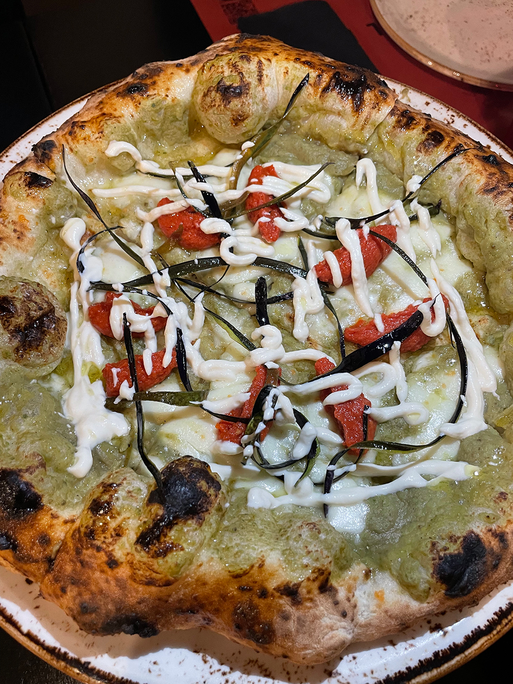 Ecco arrivare le pizze. Iniziamo con una super estiva: Pesto Vesuviano, pesto di fiori di zucchine aromatizzato con buccia di limone grattugiato, Parmigiano Reggiano Dop 30 mesi di stagionatura, bastoncini di zucchine San Pasquale cotte al vapore; all’uscita, stracciata di bufala, filetti di pomodoro pelato arrosto, foglioline di menta fresca e olio extravergine del Vesuvio.