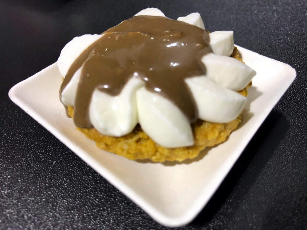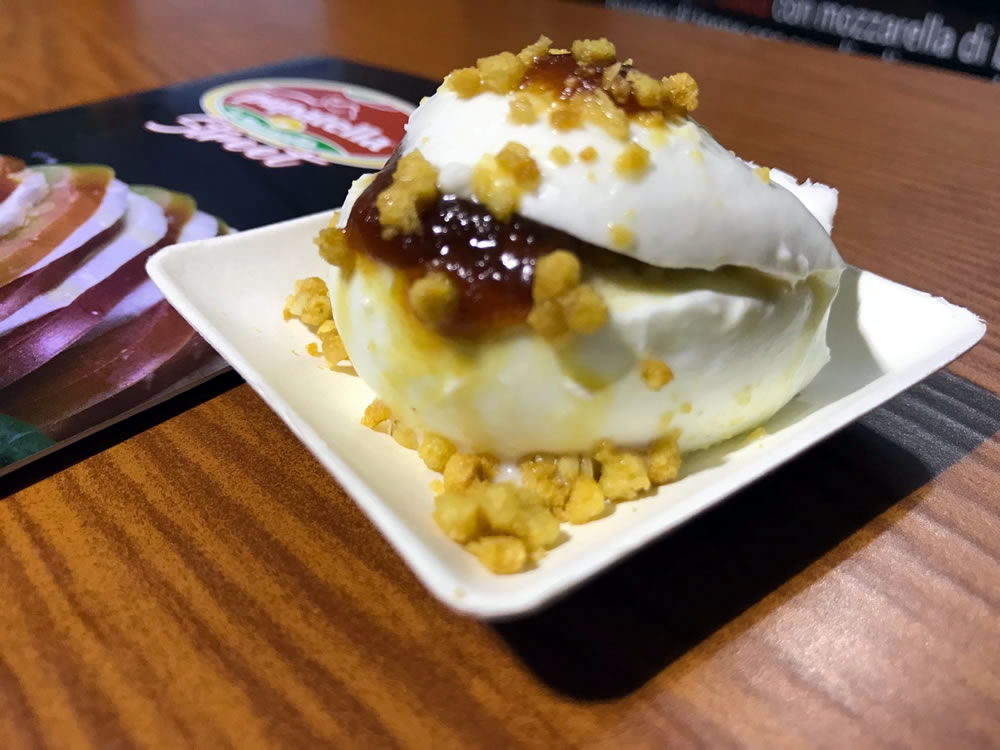Anche il dolce a base di mozzarella non manca! Bocconcino di mozzarella farcito con granella di biscotto e un composto di pomodoro o arancia.