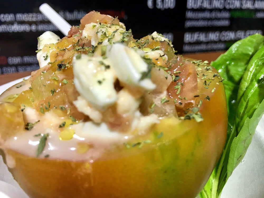 Un’altra novità è il cestino, ovvero pomodoro ripieno con tocchetti di mozzarella Pupatella, olio, origano e pane tostato