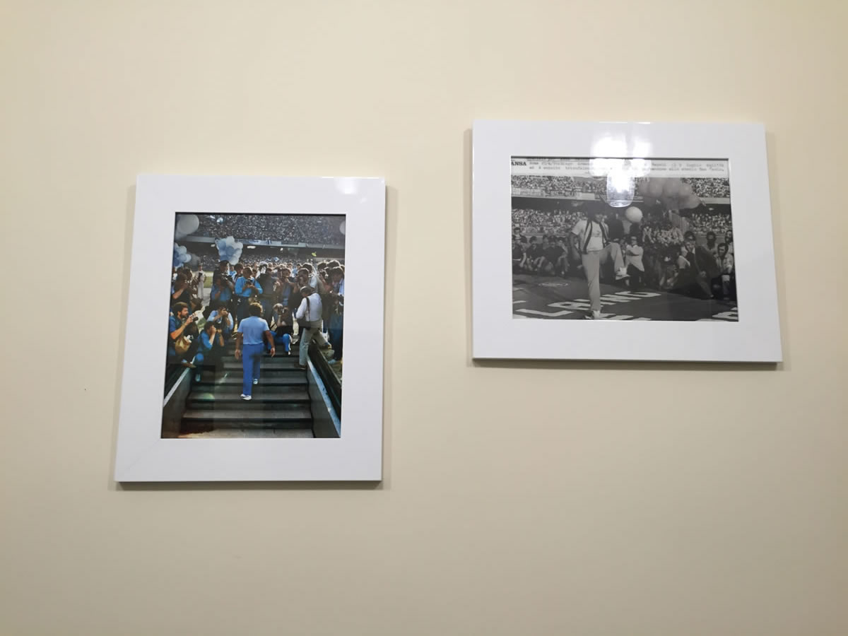 Infatti non possono mancare i quadretti che ritraggono Maradona nei suoi momenti migliori e una foto tributo allo chef Cannavacciulo.