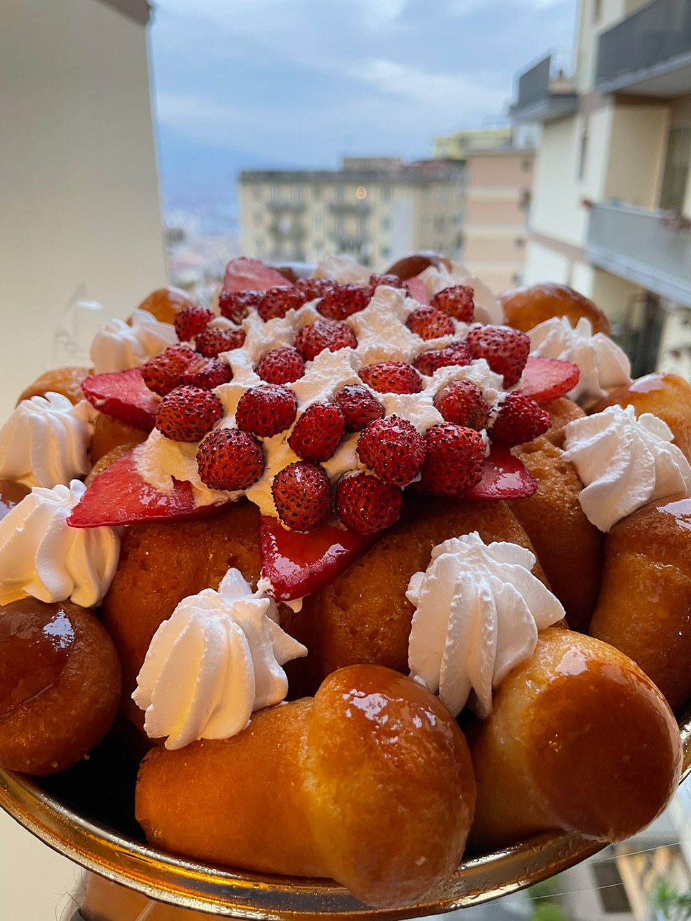 Il Babà a Napoli è un’istituzione! Dal colore dorato, a forma di funghetto da gran lievitazione è caratterizzato dalla sua bagna a base di rum che gli dona anche un profumo speciale e dal giusto equilibrio tra alcolico e zuccherino. E la consistenza? Il babà deve presentare alveoli piccoli e precisi e una volta pigiato con la nostra forchetta deve ritornare nuovamente alla sua posizione originaria.