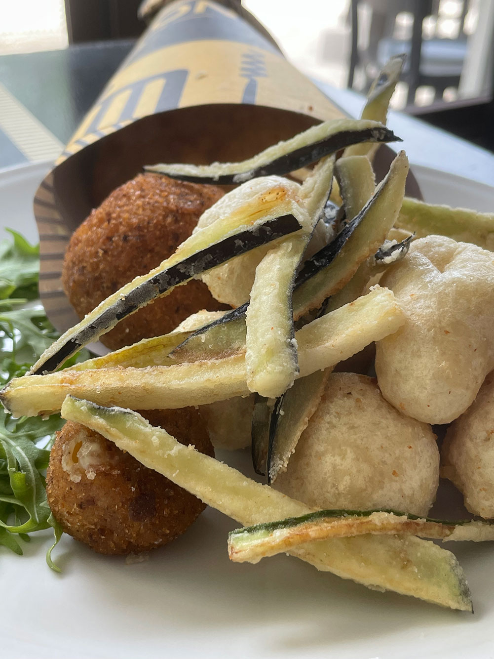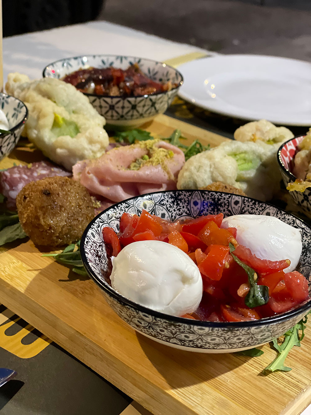 Si inizia con una batteria di antipasti di Casa Rinomato serviti su un tagliere artigianale: fiori di zucca ripieni di ricotta formaggio e pepe, parmigiana di melenzane, parmigiana di zucchine, burrata, e una carrellata di prosciutto crudo, mozzarelline ripiene, caprese.