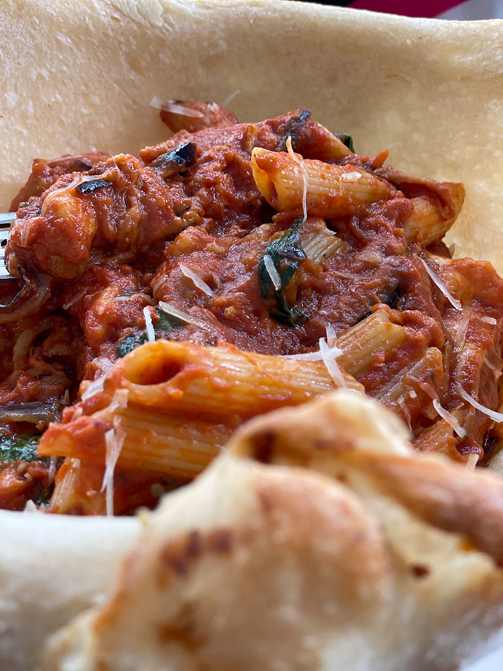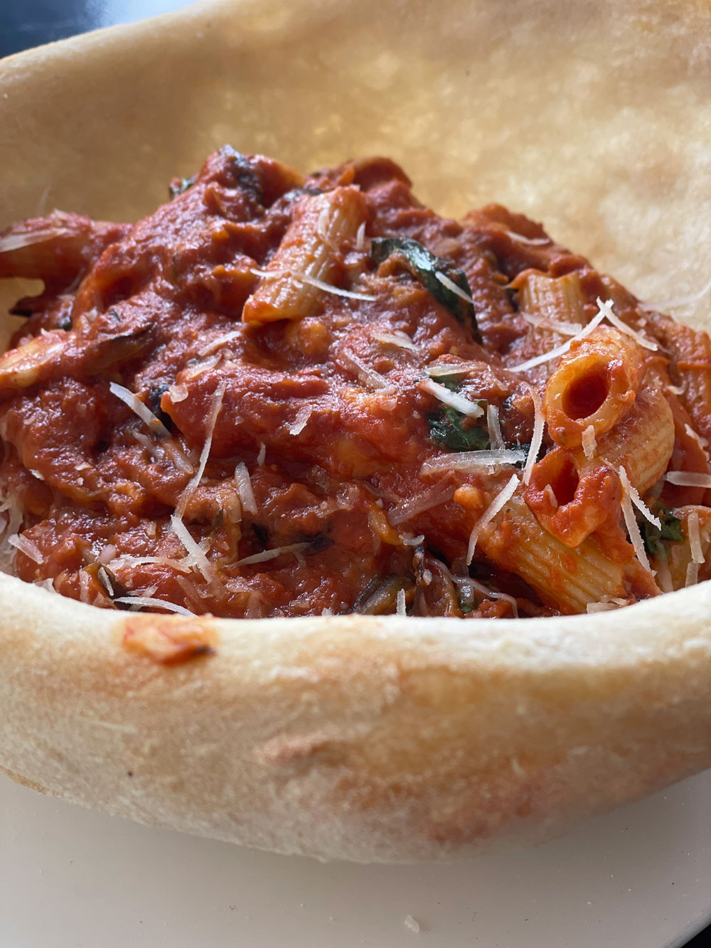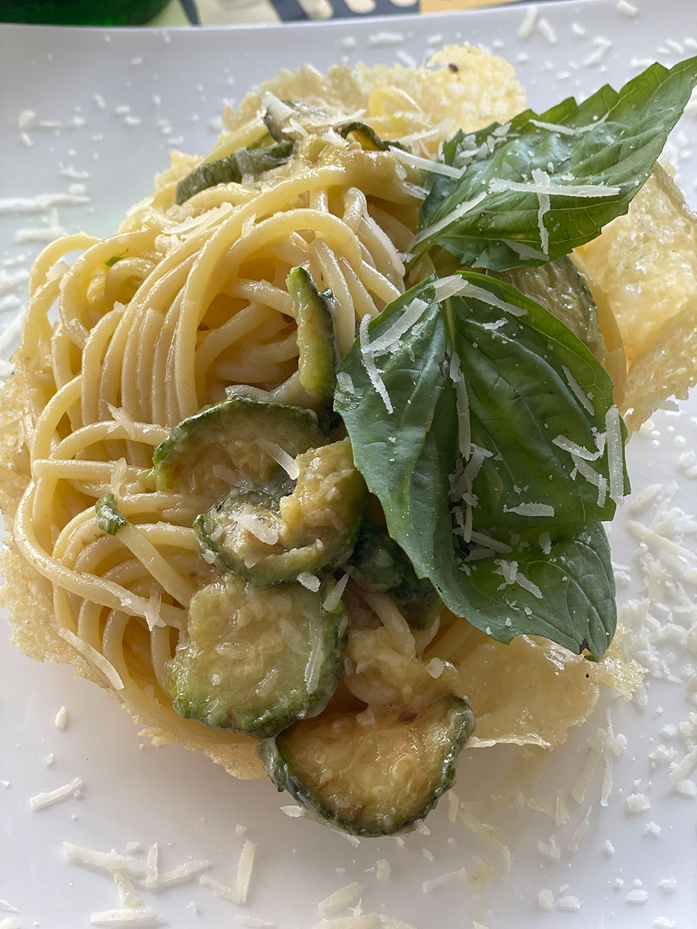 I colpi da maestro arrivano con i primi: spaghetti alla Nerano serviti su una cialda di parmigiano e pennette alla siciliana nel cesto di panpizza.