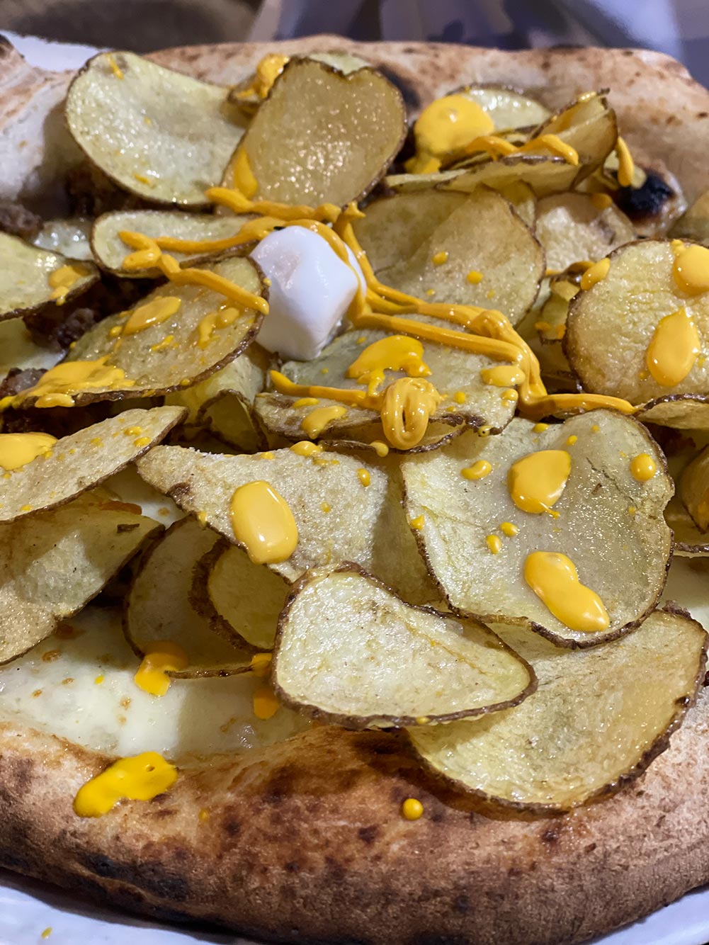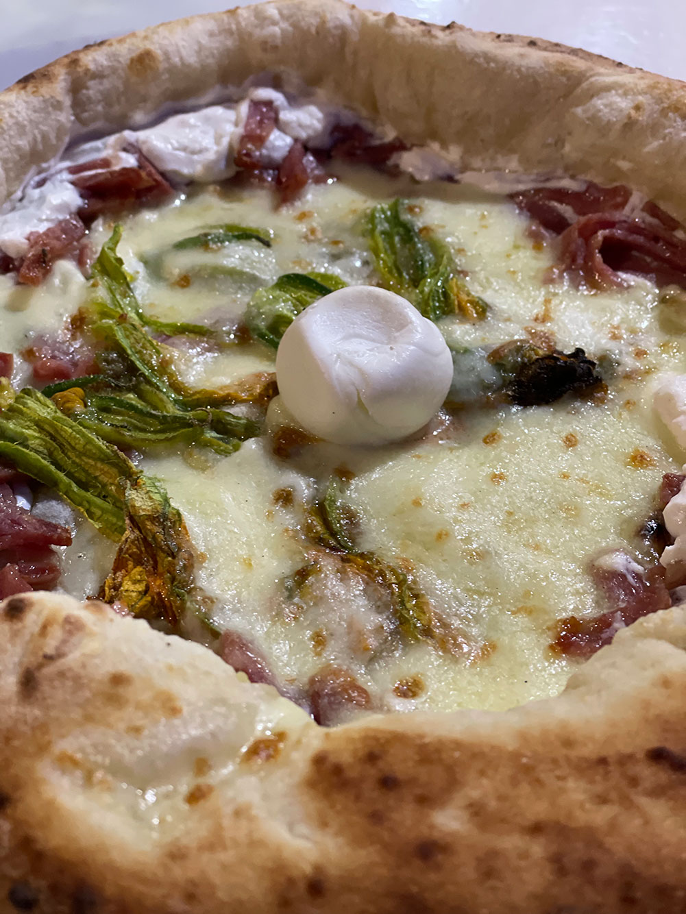 I riflettori ora sono tutti puntati sulla pizzeria. Arrivano al tavolo due pizze: la Chipsta con mozzarella, polpetta sbriciolata, polpettine, chips di patate fresche e cheddar e l’Albertone con cornicione ripieno di ricotta e salame, fiori di zucca e mozzarella. Un gran bel’inizio, ricco di sapori forti e ben bilanciati allo stesso tempo.