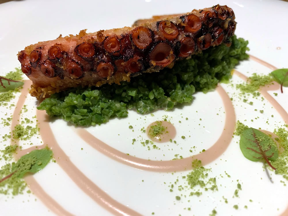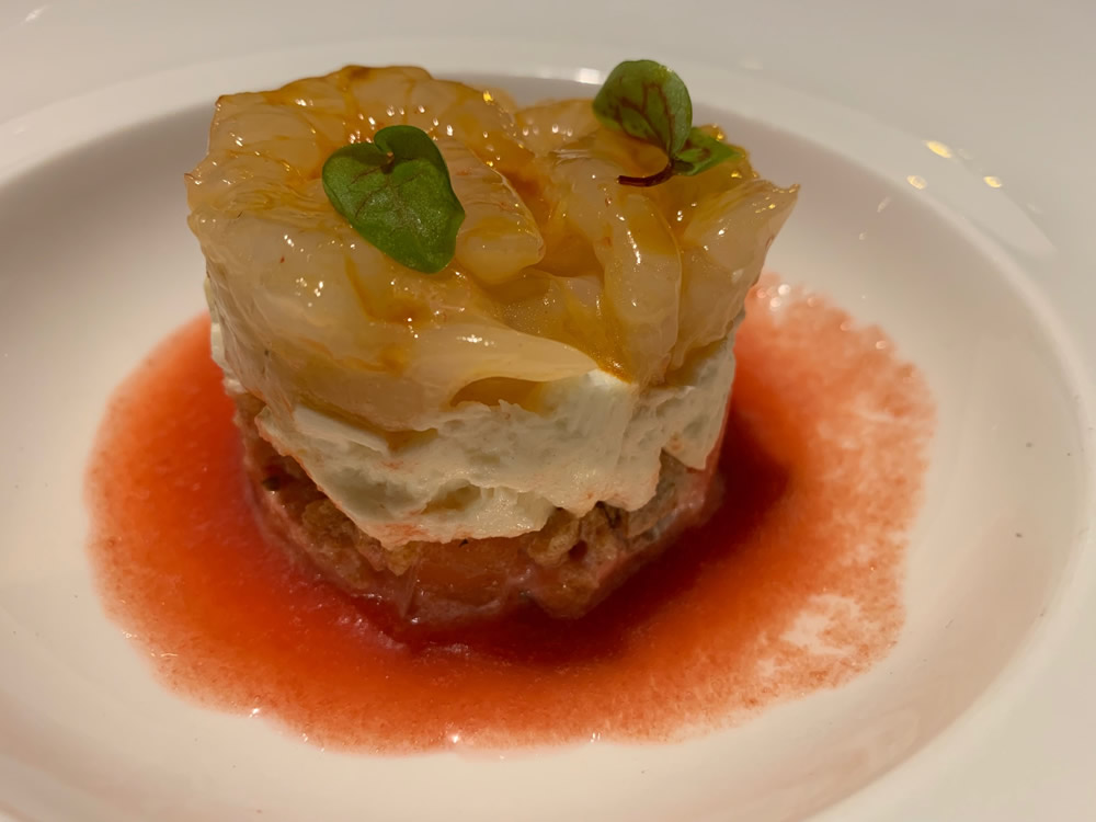 Round iniziale: Gamberi con mozzarella di bufala, fresella accompagnato da estratto di pomodoro per ammorbidire la fresella sul quale adagiato e polipo cotto a bassa tempertura adagiato su caviale di fagiolini e maionese della sua acqua.