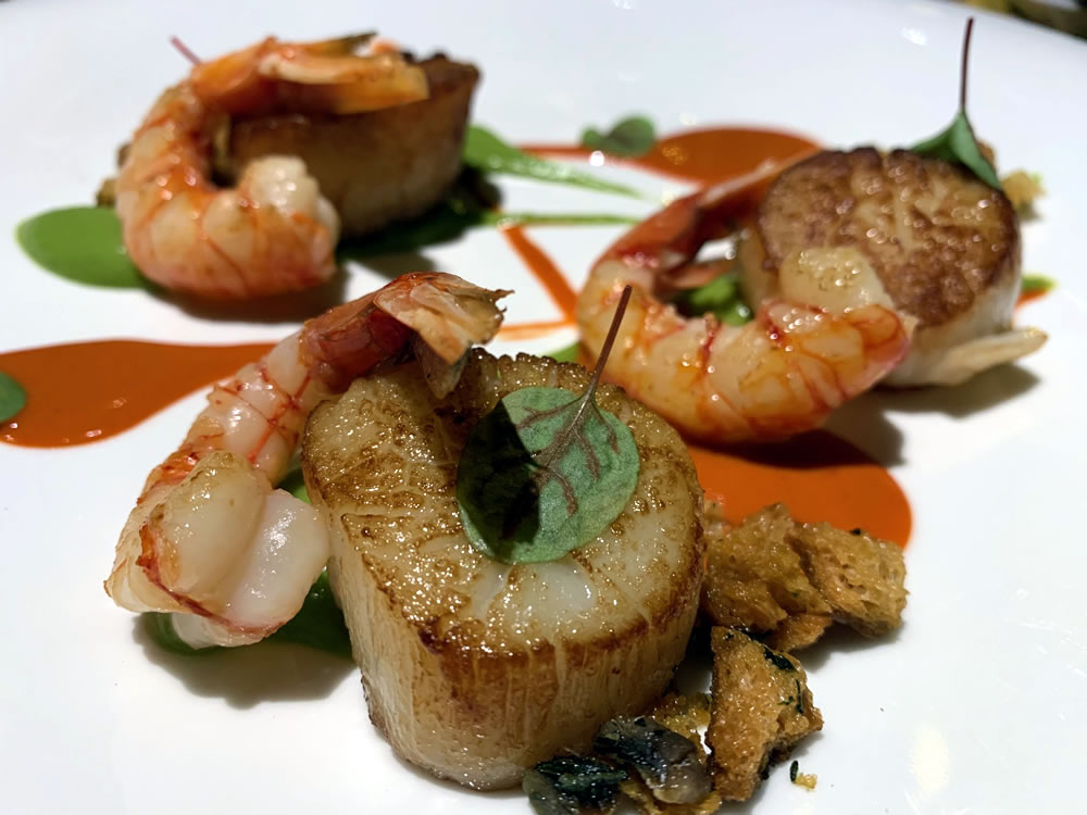 A seguire gamberi rossi di Mazara e capasante scottate con crema di piselli ed estratto di corallo e crumble di pane alle acciughe: dal sapore avvolgente e saporito. La scelta è ardua ma la prima ripresa se la aggiudica quest’ultimo anche se con gran difficoltà.