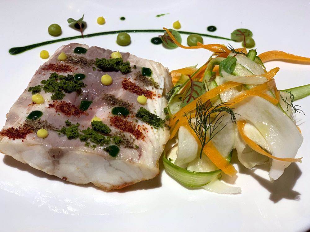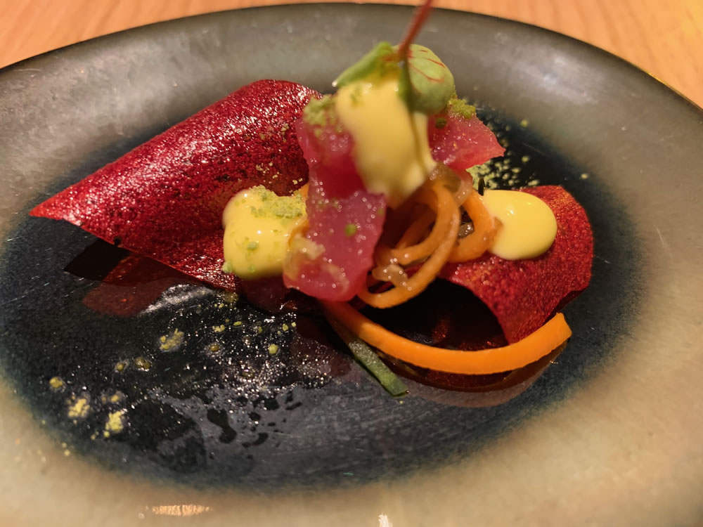 Si parte con un piccolo benvenuto della cucina: entree chips di barbabietola con tonno marinato accompagnato da un calice di Villa Russiz Collio Malvisia 2015, dal colore giallo paglierino e con sentori aromatici di albicocche e pesche.