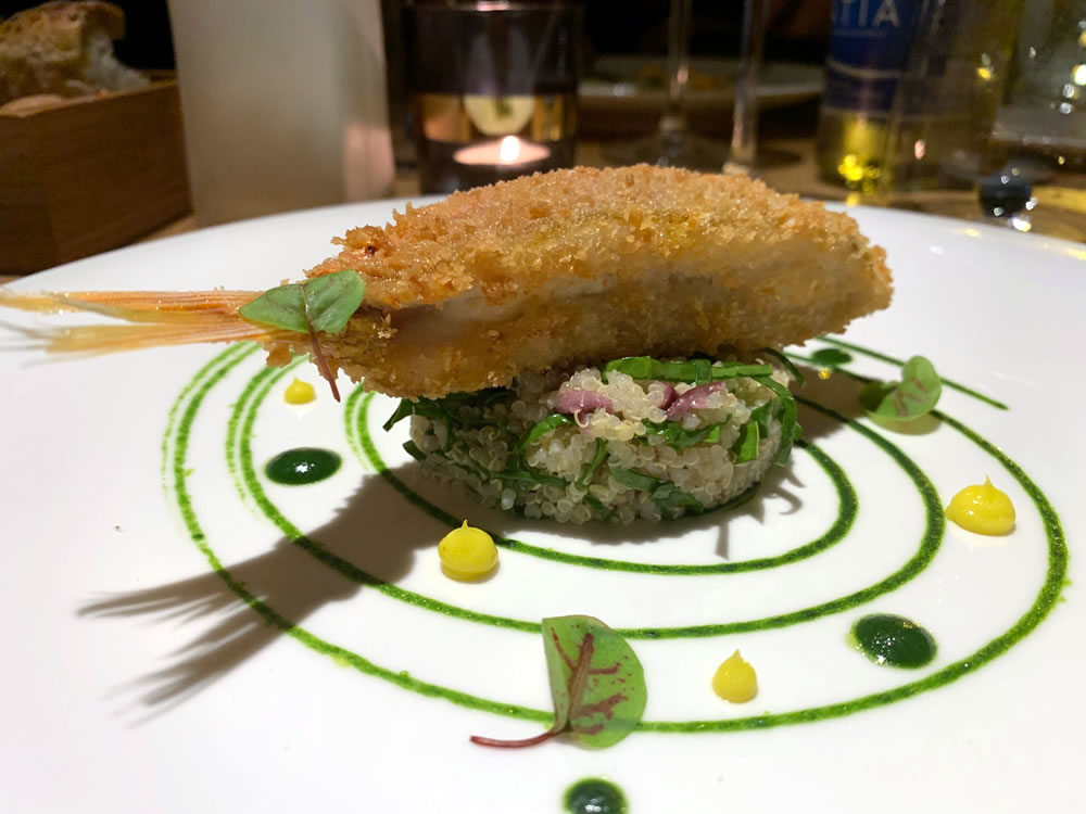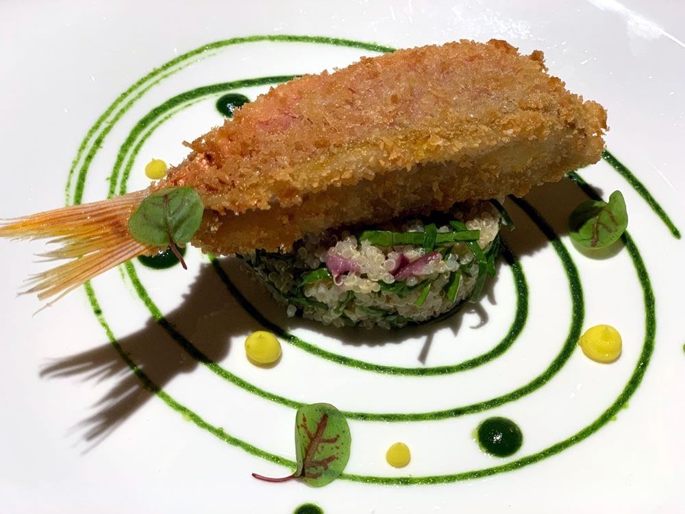 Convince a pieni voti la triglia ripiena in crosta di pane panko quinoa e olive nere di Gaeta…un tourbillon di sapori!