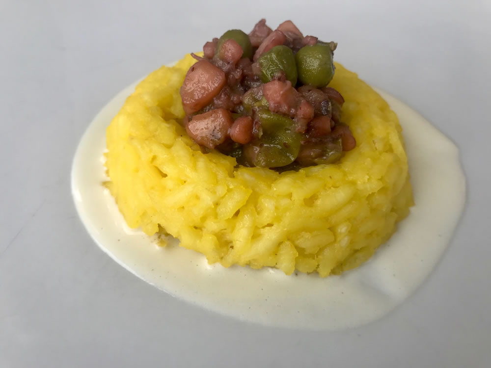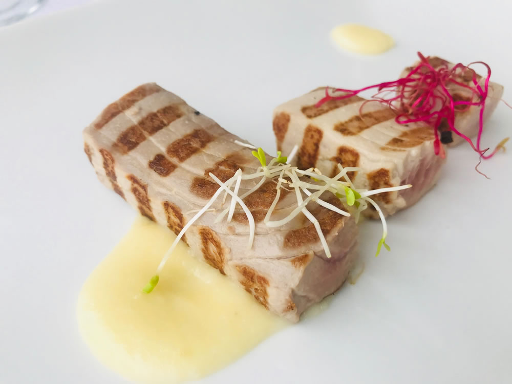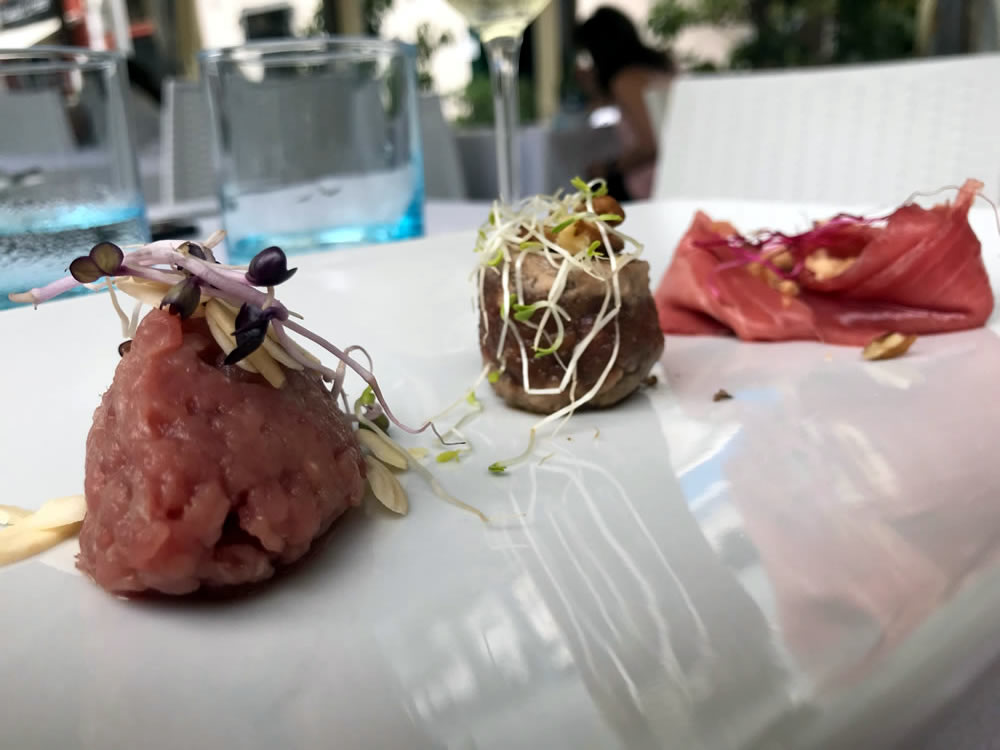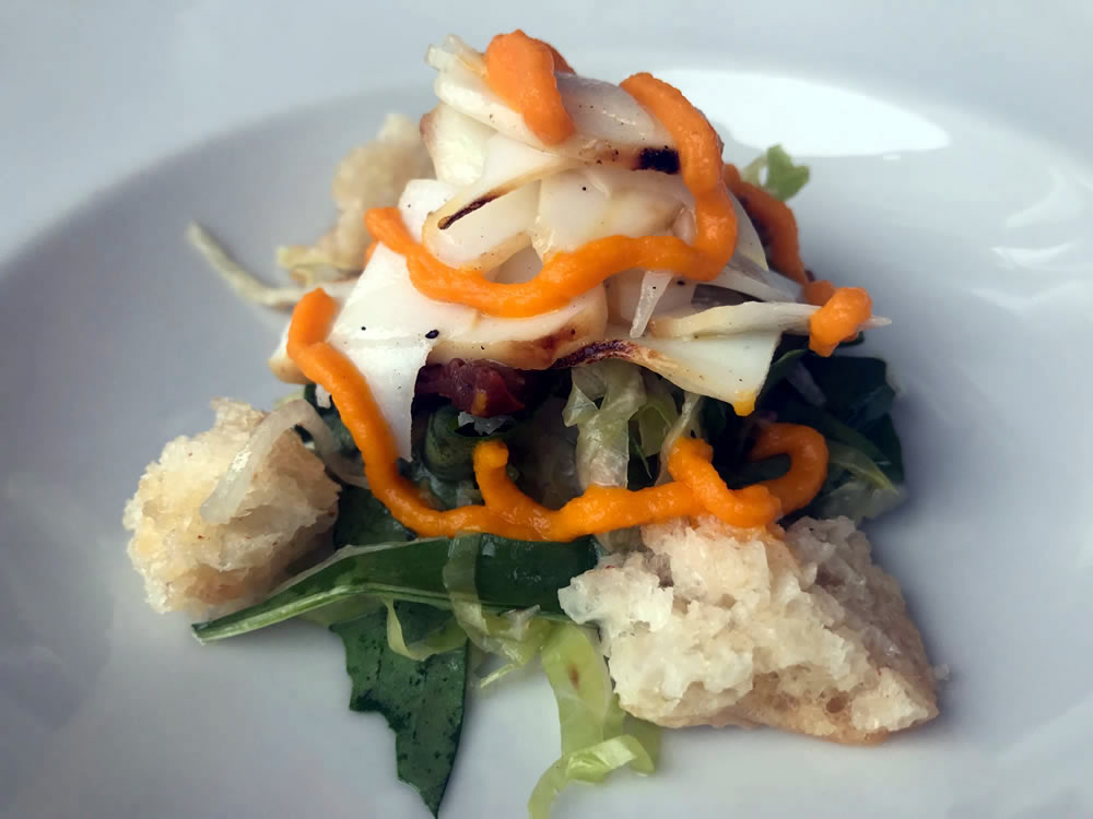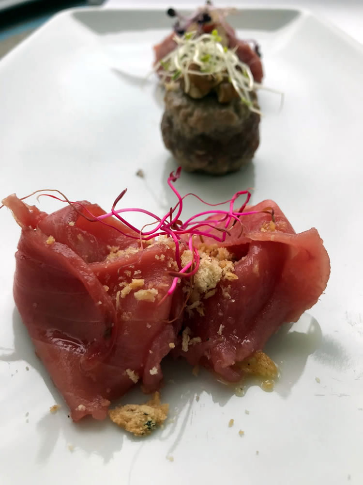 Si prosegue con una Falanghina del Sannio DOP Janare, dal colore giallo paglierino e dal gusto bilanciato e piacevole, e a seguire la batteria degli antipasti che ci piace molto: tonno in tre consistenze: tartare di tonno con mandorle, carpaccio di tonno con tarallo napoletano, crudo e cotto di tonno con noci, arancino di mare con totano, salmone con yogurt magro, alice marinato spuma all’arancia e spuma di ricotta, caponata di verdure con seppie e carote.