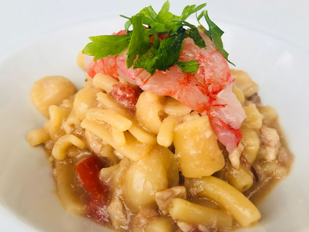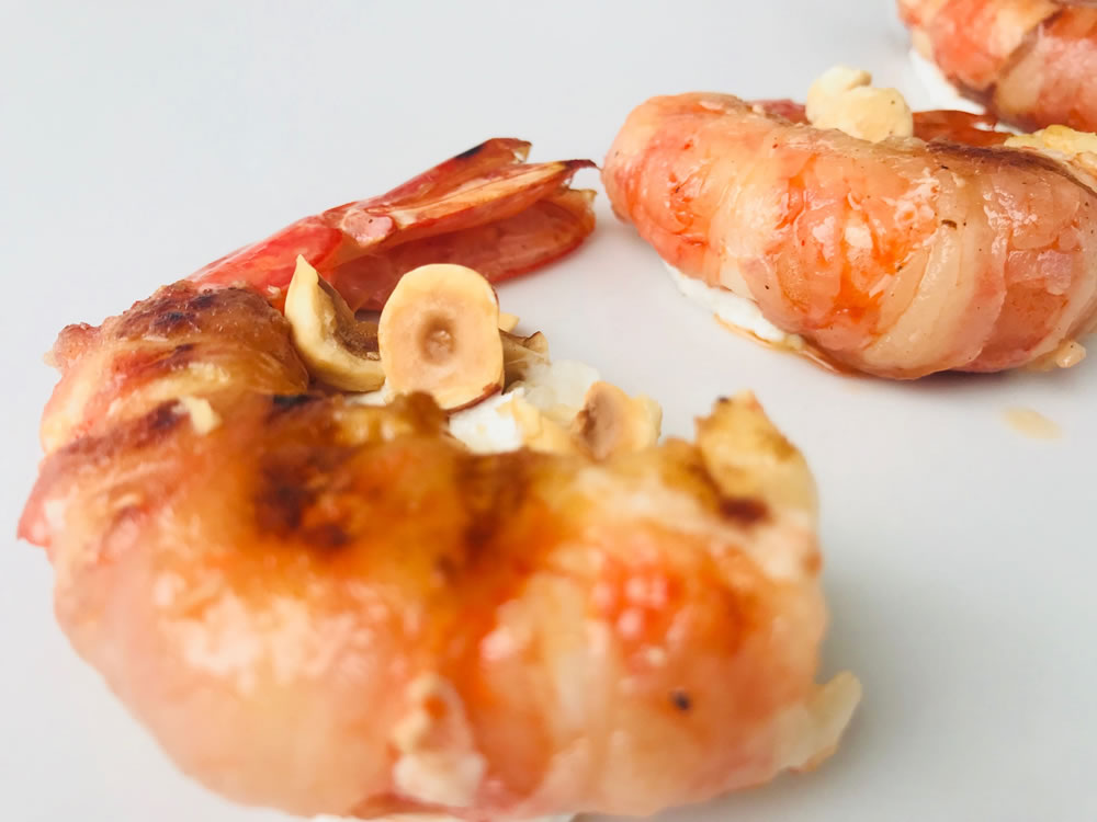Ultimo delle serie, ma soprattutto buonissimo e delicatissimo il gambero lardellato con caprino e nocciole.